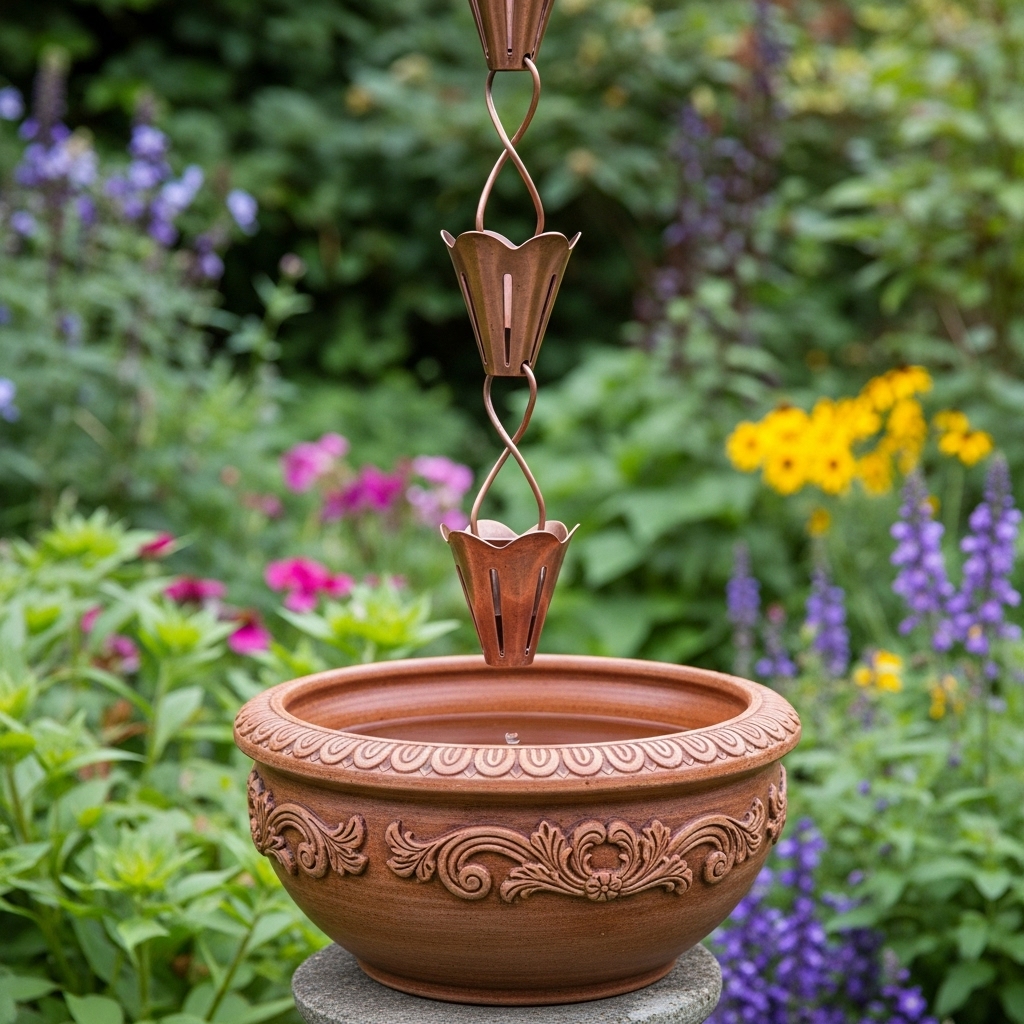 Rain chains are functional and decorative alternatives to traditional downspouts. They guide rainwater through a chain of cups or links and slow the flow into a basin or collector below. This reduces splashing and soil erosion and adds visual appeal to your garden, making them a favorite among landscape designers.