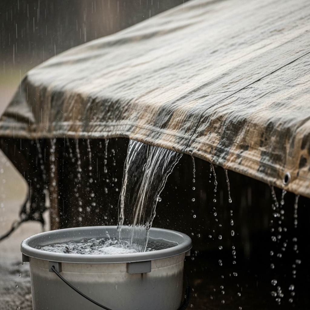 If you’re short on materials or need a quick fix, you can use a tarp to funnel rainwater into a container. Secure the tarp at an angle using poles or trees, and let gravity guide the water into a bucket. It’s great for camping, emergencies, or remote gardens with no structures nearby.