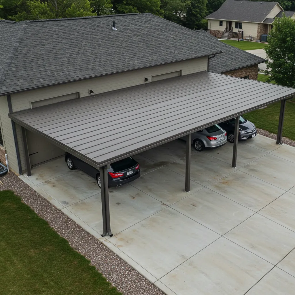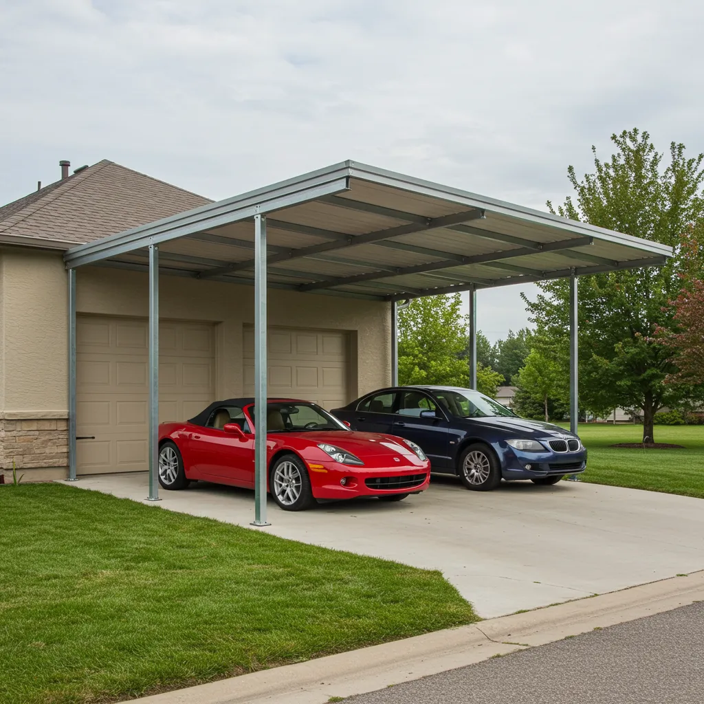 If your home has a modern architectural style, a minimalist metal carport can be the perfect match. Using steel or aluminum with clean lines and a flat roof gives a contemporary vibe while ensuring strength and longevity.