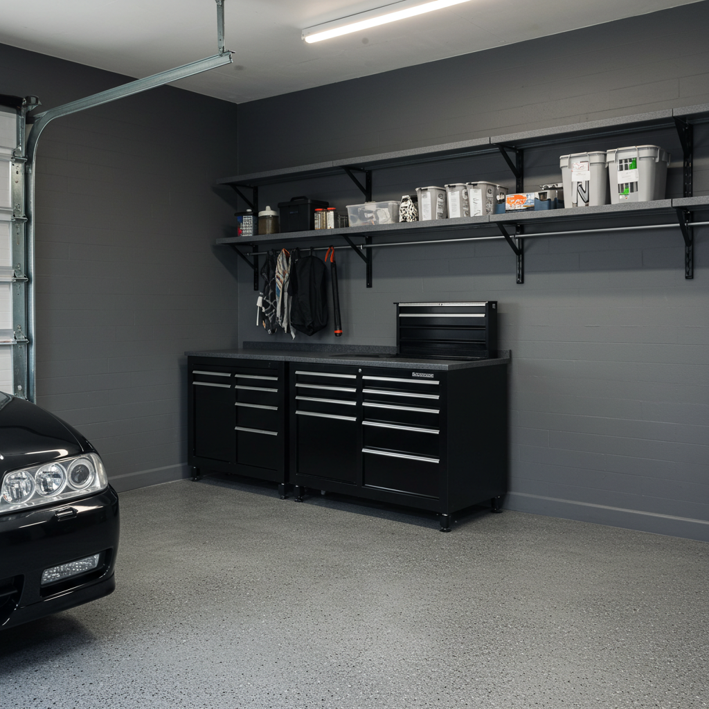 Love the raw, unfinished vibe? Embrace the industrial look with concrete grey. You can either paint walls in this tone or use a faux finish to mimic real concrete. Pair with metal shelving and minimal décor for a warehouse-inspired garage.