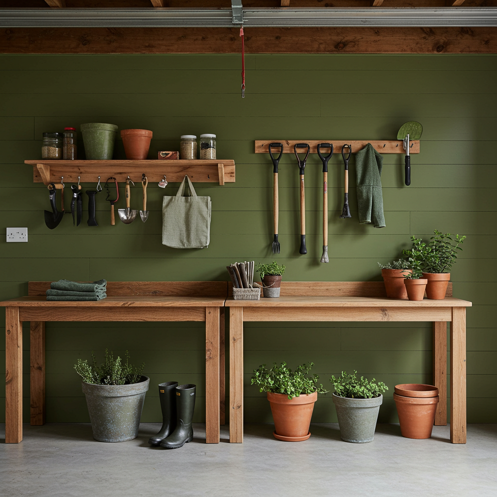 Sage green, olive, or mossy tones bring calmness and nature into your garage. These colours work well if you use your garage as a garden workshop or multipurpose space. Green pairs nicely with wood, stone, and light grey tones.