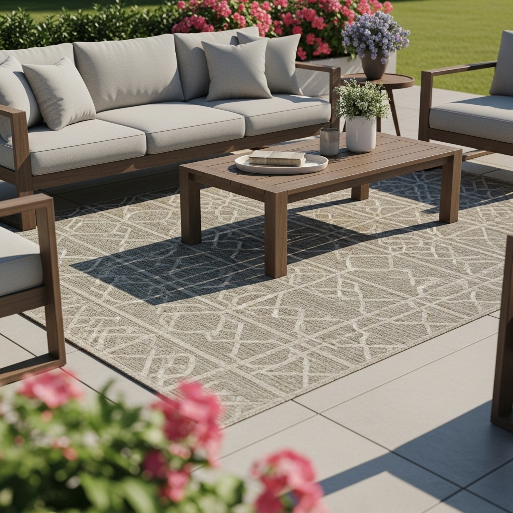 An outdoor rug ties furniture together and defines your seating space visually. Choose rugs made of weatherproof material that can handle sun, rain, and foot traffic. Match or contrast with your cushion colors for a pulled-together look.