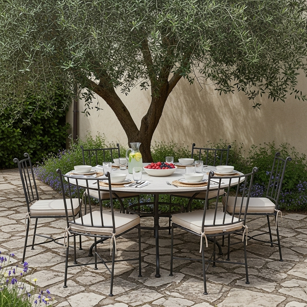 Round tables take up less visual space and allow for easier movement around the patio. They also encourage conversation and look great in the center of garden areas. Opt for metal or wicker with glass tops for durability.