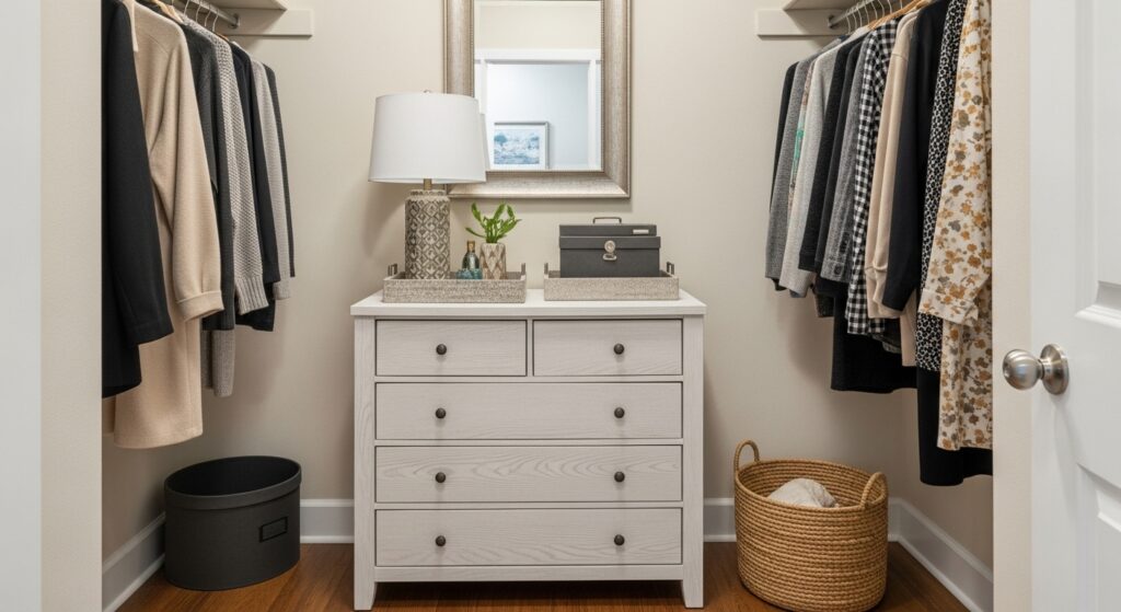 A narrow dresser can fit perfectly at the bottom of a reach-in closet. It adds closed storage for folded clothes, accessories, or even pajamas. Use the top surface for jewelry trays, perfumes, or folded items.