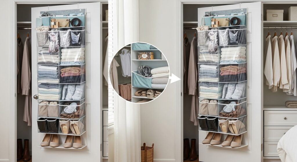 The inside of your closet door is the perfect spot for extra storage. Install hooks, over-the-door racks, or fabric organizers for shoes and accessories. This gives you easy access to daily essentials without using shelf space.