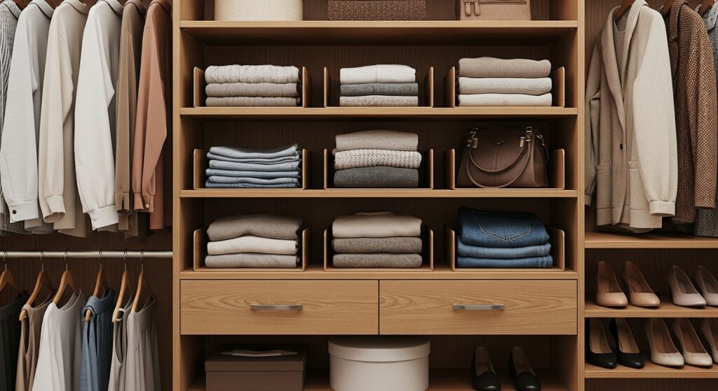Shelves can quickly become a mess without proper support between clothing stacks. Use acrylic or wire dividers to separate folded garments like sweaters and jeans. It keeps everything in neat piles and prevents toppling.