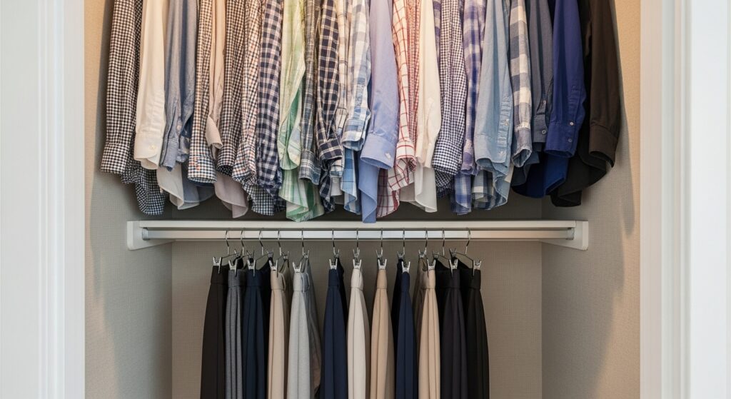Maximize vertical space by adding a second hanging rod below the existing one. This instantly doubles your storage for shorter clothing like tops and pants. Choose adjustable rods to fit your exact closet dimensions and layout.