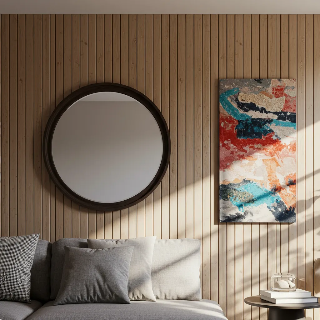 Styling Idea: Pair a wooden wall panel with a mirror and fabric art for a balanced, curated look.