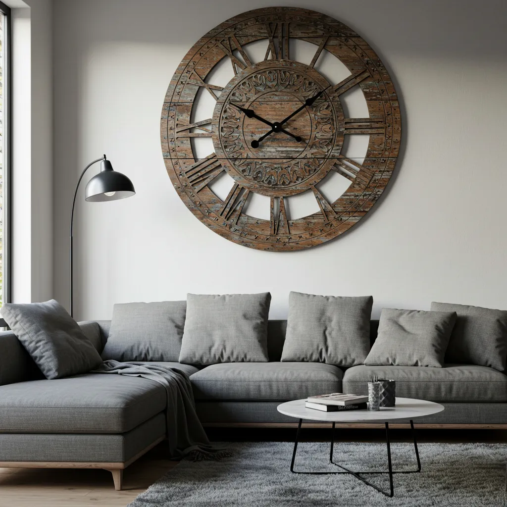 A large decorative wall clock can be both functional and stylish. Choose modern minimalist clocks, rustic wooden designs, or industrial-style pieces to complement your interior theme.